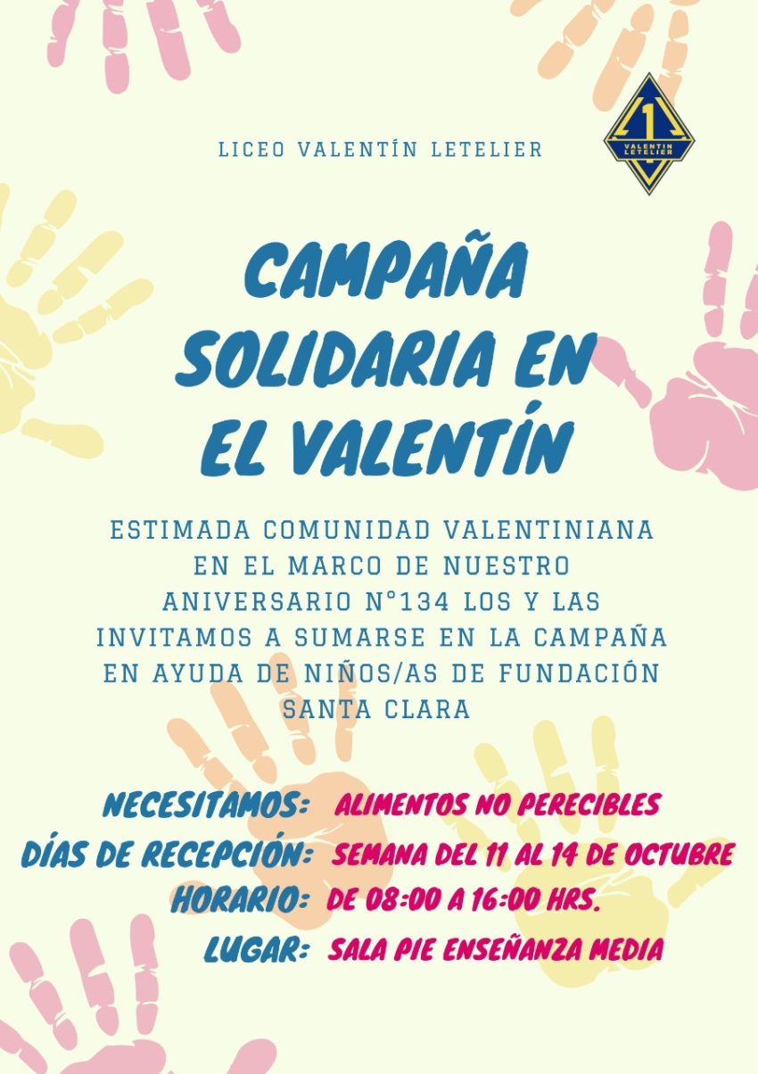 En el marco de nuestro aniversario n° 134, el Liceo Valentín Letelier generará una campaña solidaria de recolección de alimentos no perecibles, los que irán en ayuda a niños y niñas que viven con VIH/SIDA pertenecientes a la casa de acogida de Fundación Santa Clara, emplazada en el sector de Recoleta-Sur.