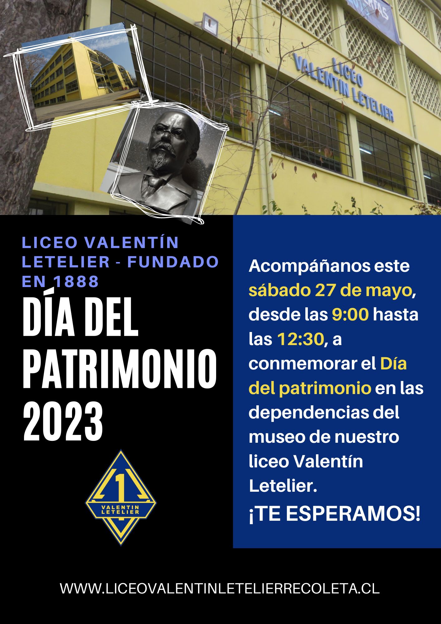Mayo 25, 2023 Día del Patrimonio en el Valentín Acompáñanos este sábado 27 de mayo, desde las 9:00 hasta las 12:30, a conmemorar el Día del patrimonio en las dependencias del museo de nuestro liceo Valentín Letelier. ¡TE ESPERAMOS!