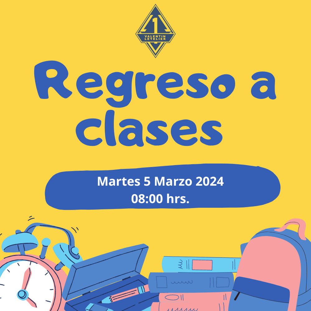 Febrero 26, 2024 Regreso a clases 2024. Los horarios de salida serán comunicados durante esta semana. ¡Los y las esperamos para empezar un año 2024 con todo!