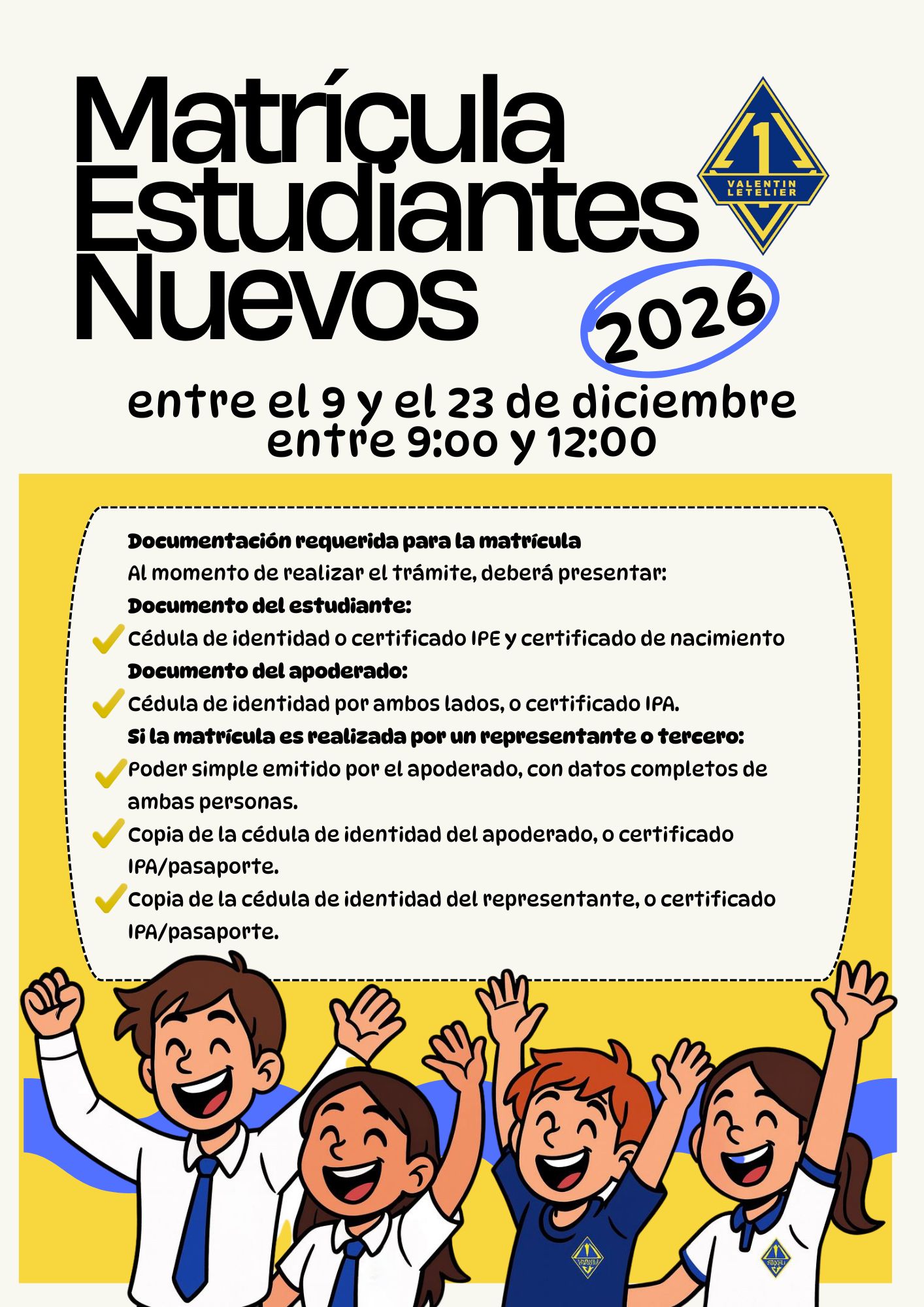 El Liceo Valentín Letelier informa a la comunidad educativa que ya se encuentran disponibles los resultados del Sistema de Admisión Escolar (SAE) para el año académico 2026, y que los estudiantes admitidos deben formalizar su matrícula de manera presencial en el establecimiento. Agradecemos la confianza depositada y damos la más cordial bienvenida a quienes se integran a nuestro liceo.