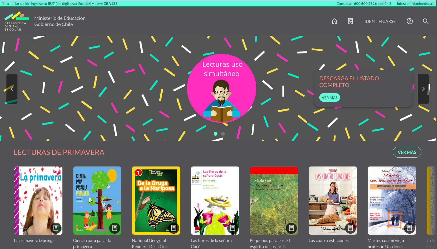 Biblioteca digital escolar: es una biblioteca online, habilitada para todos/as los estudiantes del país. En este espacio se podrán realizar préstamos de libros digitales según el gran catálogo que se ofrece.